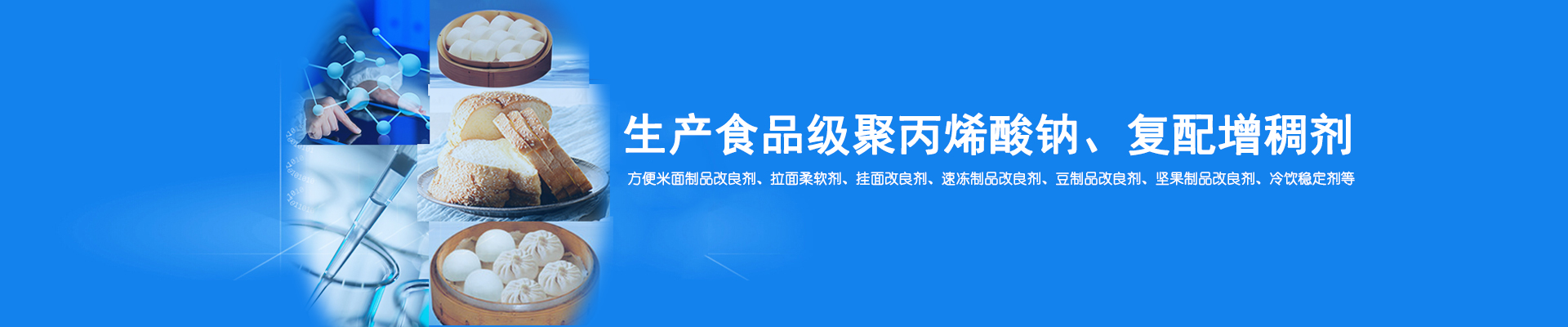 食品級(jí)聚丙烯酸鈉、復(fù)配乳化劑、復(fù)配膨松劑、復(fù)配著色劑、復(fù)配水分保持增稠劑、復(fù)配酸度調(diào)節(jié)增稠劑、復(fù)配抗氧化劑、方便米面制品改良劑、拉面柔軟劑、掛面改良劑(亮白、亮黃型)、速凍制品改良劑、豆制品改良劑(如腐竹)、堅(jiān)果制品改良劑、冷飲穩(wěn)定劑等。