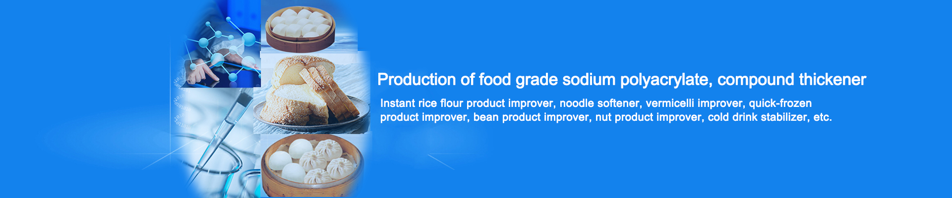 Dehuiyuan biotechnology is specialized in the production of food grade sodium polyacrylate, compound emulsifier, compound leavening agent, compound colorant, compound water retention thickener, compound acidity adjusting thickener, compound antioxidant, instant rice flour product improver, ramen softener, vermicelli improver (bright white and bright yellow), quick-frozen product improver, bean product improver (such as Yuba) and Jianjian Fruit product improver, cold drink stabilizer, etc.