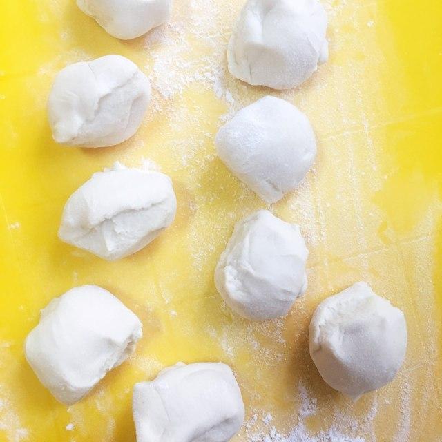 5、將揉好的面團放在案板上,搓成長條形狀,切成幾個小劑子,稍微大一點,做出來的麻團就稍微大點,喜歡吃餡的可以根據自己喜好加點豆沙或者不加都可以。