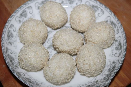 6、然后將每個小劑子搓成圓形,在放有芝麻的碗中,滾一下,就有麻團的雛形了。